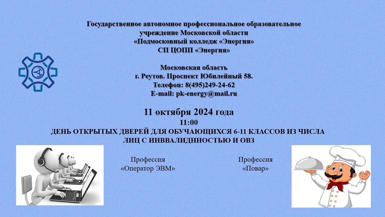 11 октября 2024 года в 12:00 в структурном подразделении Центра оборонно-промышленной подготовки Подмосковного колледжа «Энергия» пройдет День открытых дверей для поступающих, имеющих инвалидность или ограниченные возможности здоровья.