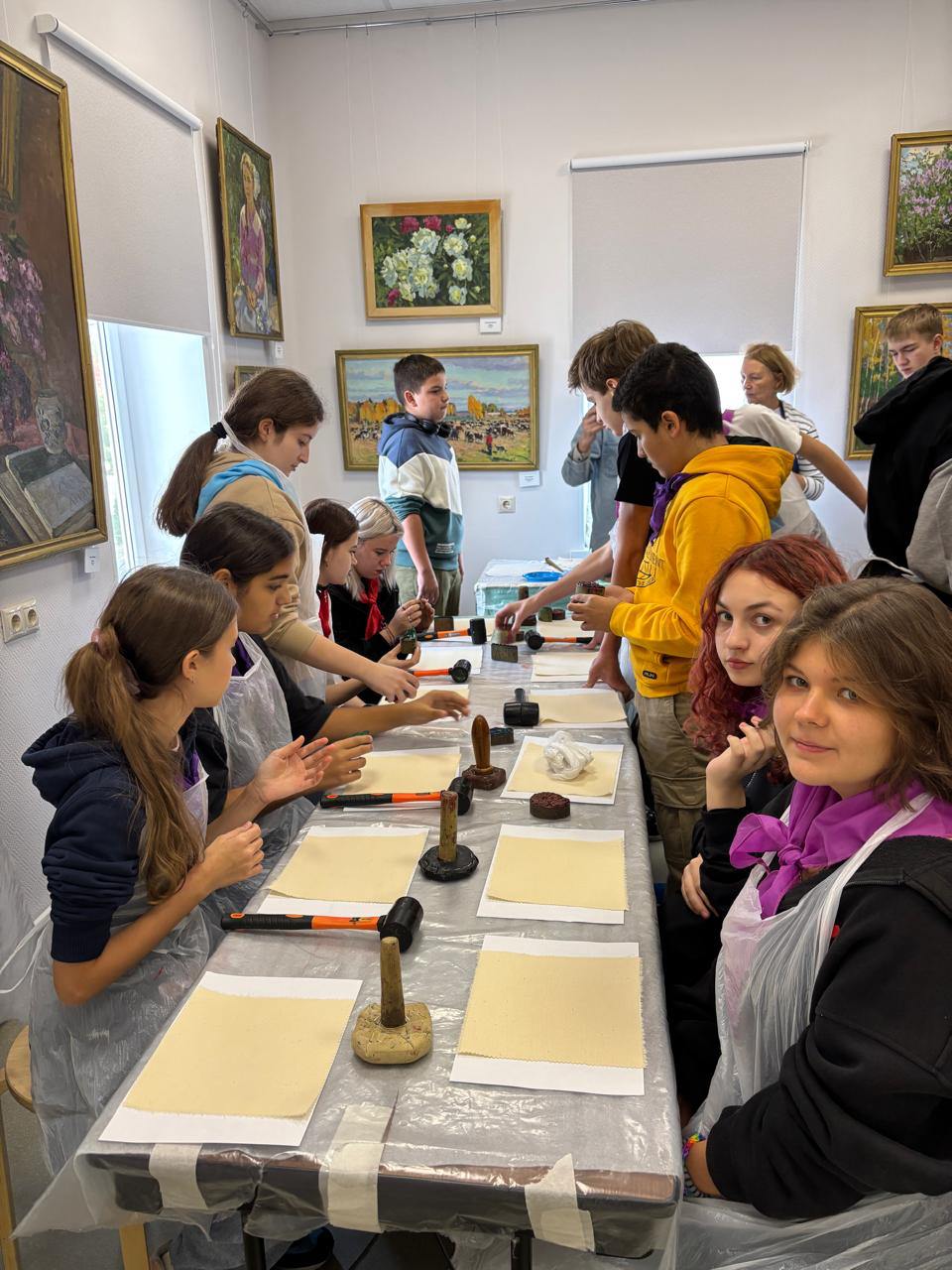 Затем состоялся мастер-класс «Возьми набойку с собой». Своими руками ребята создавали с помощью деревянных набойных досок и акриловых красок авторский аксессуар на салфетках. Каждый с большим старанием, так же, как и в старину, наносил рисунок на ткань с помощью специальных досок, которые потом вручную прибивали специальным молотком — киянкой. Учащиеся остались довольны посещением этого музея, своей работой, о чем свидетельствуют оставленные отзывы.