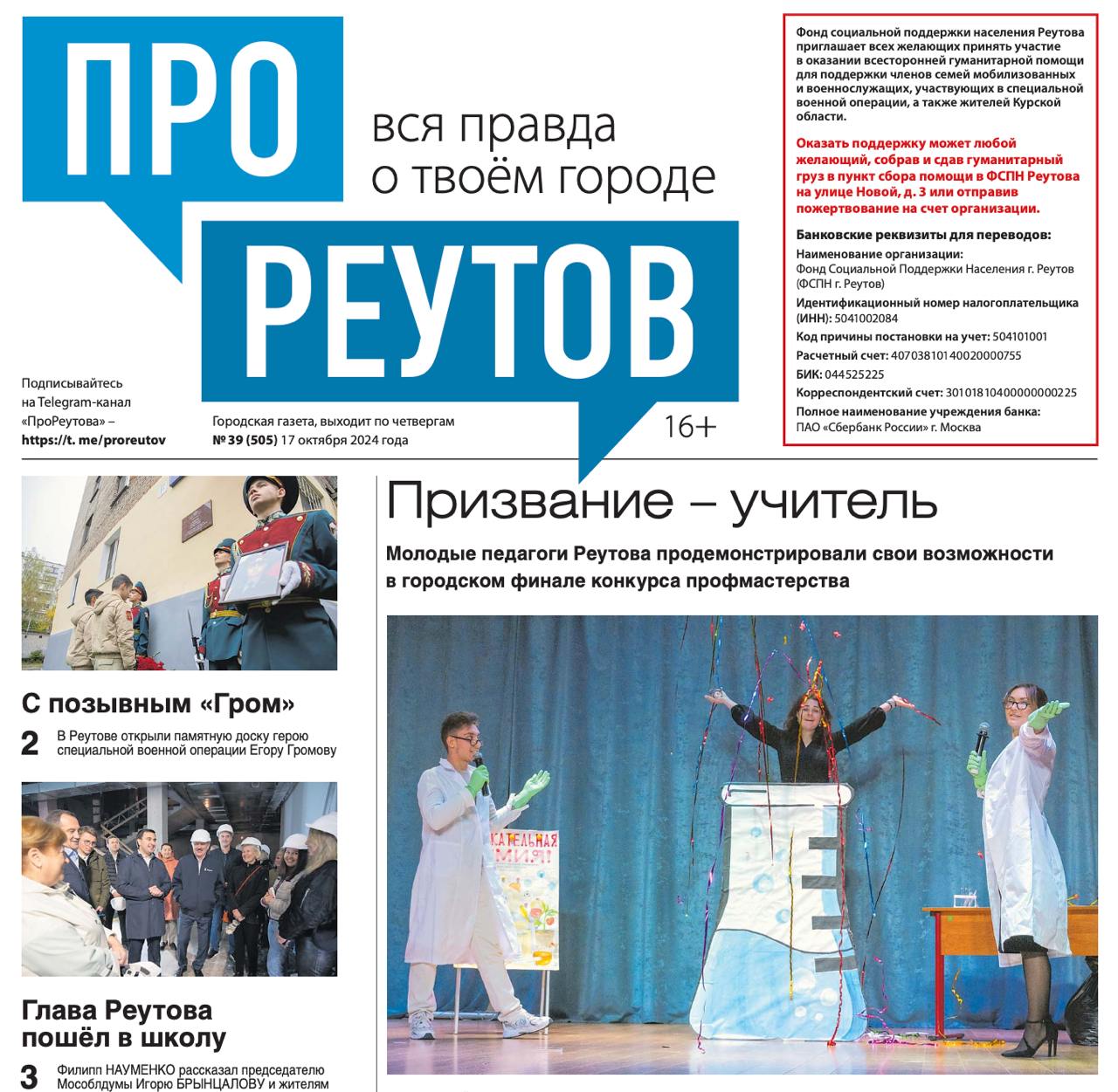 В четверг, 17 октября, вышел 39-й (505) выпуск бесплатной газеты «ПроРеутов».