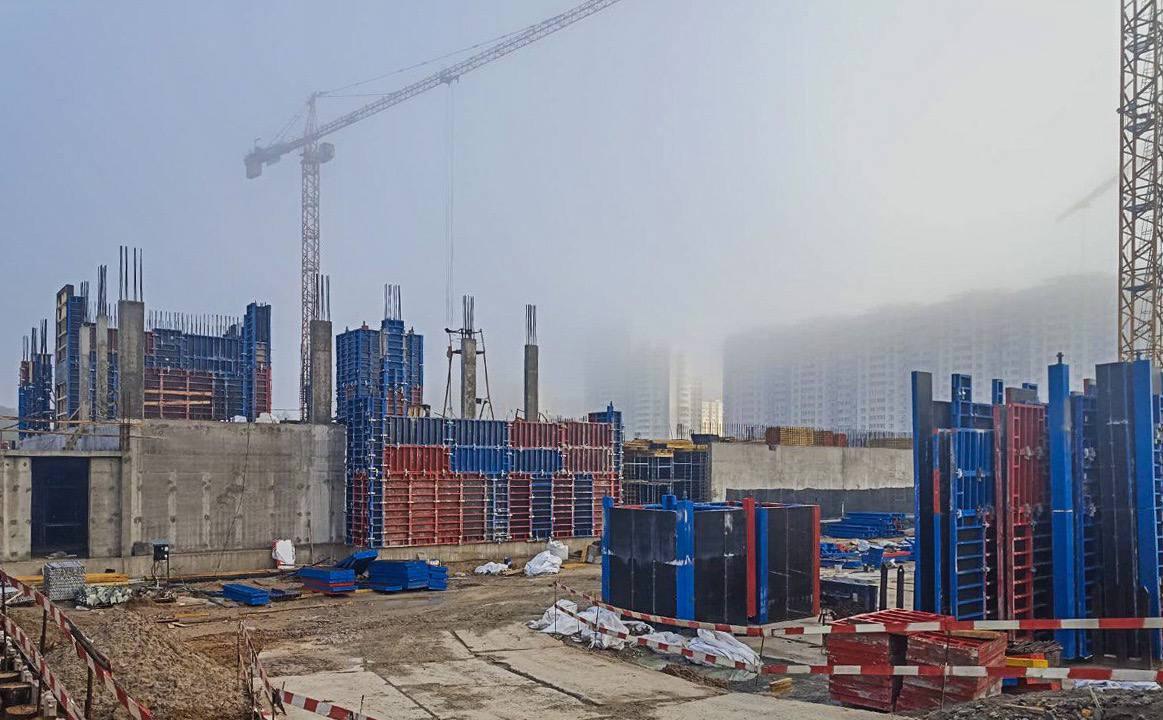 На площадке трудятся 200 рабочих и 36 единиц техники. Ведутся работы основного периода: армирование и бетонирование стен и колонн 1 этажа главного корпуса - блок 1, устройство фундаментной плиты на блоках 2,3 и 4.