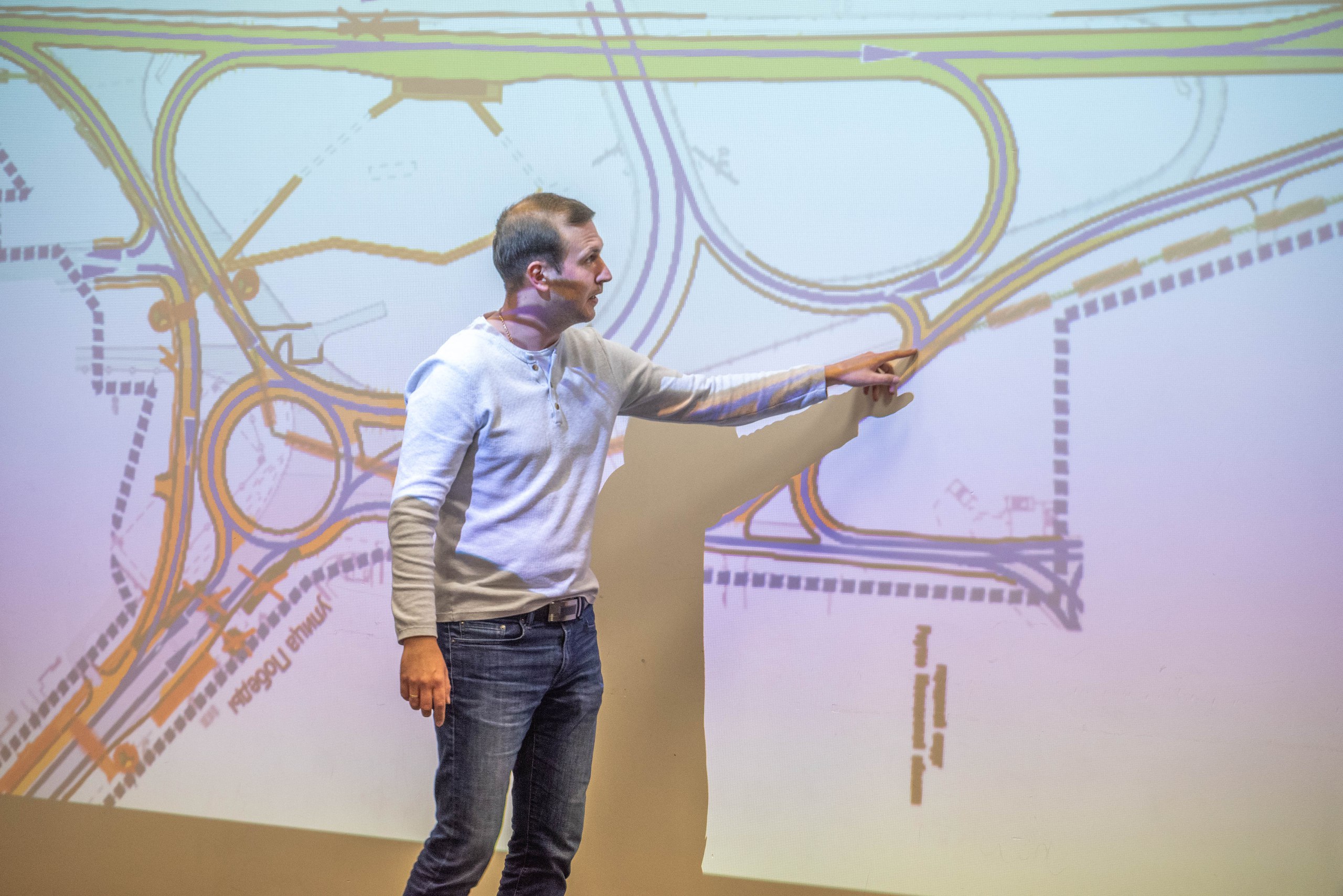 Схема реконструкции кольцевой и связанных с ней дорог муниципалитета была выведена на большой экран. Это позволило всем собравшимся увидеть аспекты пока ещё не утверждённого проекта.