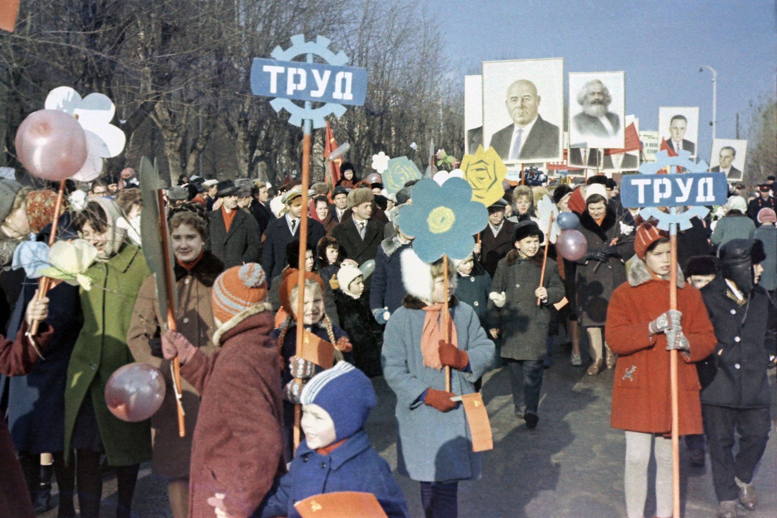 На фотографии, опубликованном https://vk.com/madeinsu - Реутов, 7 ноября 1966 года, непременное масштабное мероприятие - демонстрация. Автор фото - Пётр Рост.