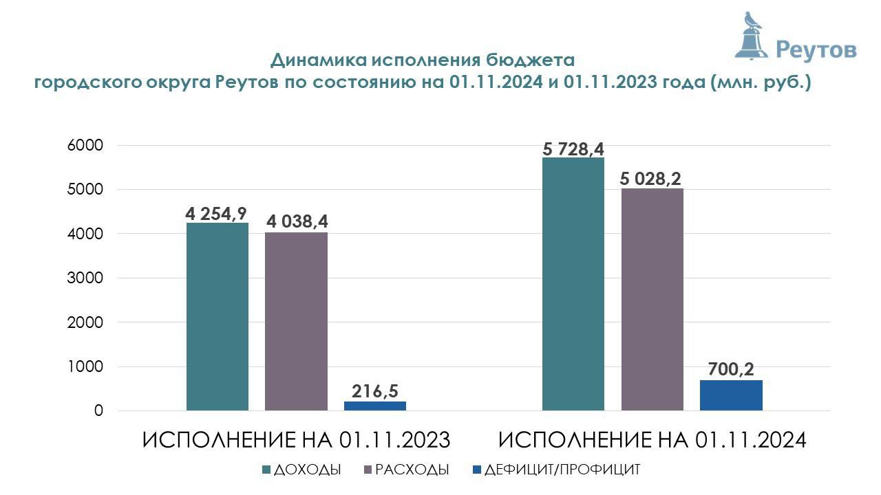 По итогам октября 2024 года поступления доходов в бюджет городского округа Реутов составили 5 728,4 млн. рублей, что составляет 79,7 % от годового плана.