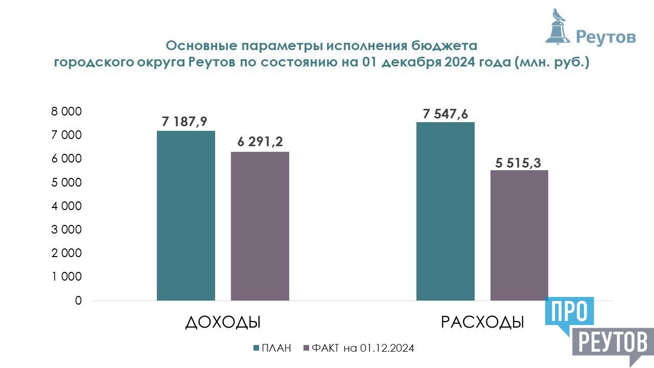По итогам ноября 2024 года поступления доходов в бюджет городского округа Реутов составили 6 291,2 млн. рублей или 87,5 % к годовому плану, в том числе по налоговым и неналоговым доходам поступило 2 937,1 млн. рублей или 99,3 % к годовому плану.