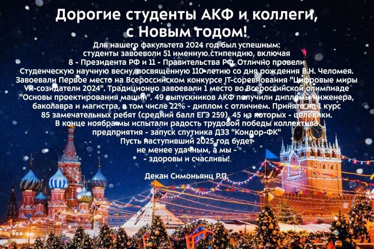 В своём новогоднем поздравлении декан аэрокосмического факультета МГТУ имени Н. Э. Баумана Р. П. Симоньянц отметил главные достижения, которые были достигнуты в 2024 году.