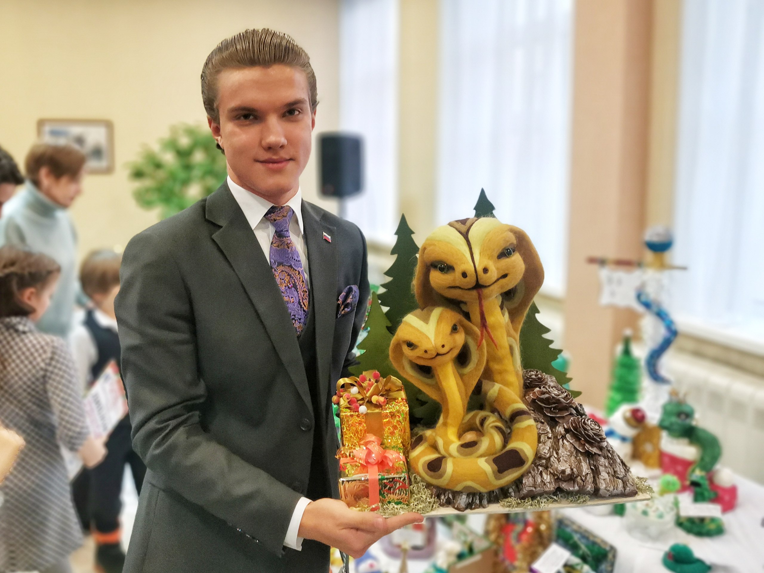 — В этом году летом я отдыхал в Крыму, веточки и шишки для этой композиции привёз оттуда, а самих змей валял из шерсти с помощью специальных иголок, на работу ушло 2,5 месяца, — рассказал Даниил.
