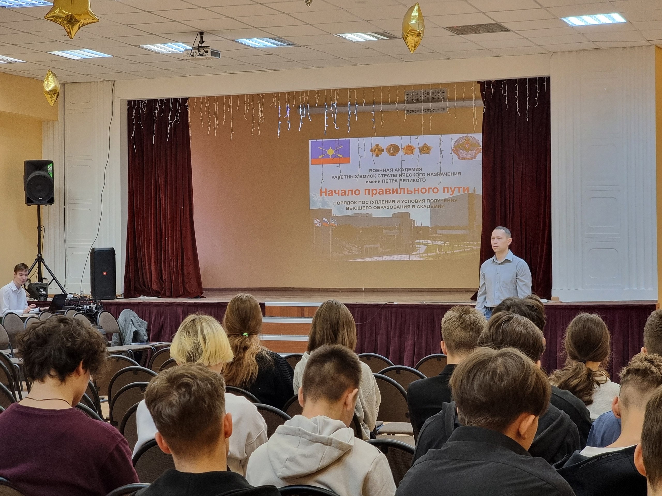 В шестой школе прошло увлекательное профориентационное мероприятие для учеников 10 и 11 классов. Ребята приветствовали представителя Военной академии Ракетных войск стратегического назначения имени Петра Великого, который поделился уникальной информацией о профессиях и возможностях, которые открываются перед молодыми специалистами в этой важной области.