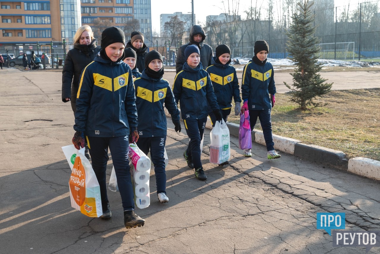 Следующей точкой стало здание спортивной школы «Приалит». В нём к уже стоящей у входа пирамиде из коробок с помощью прямо с тренировки пришла целая команда футболистов 2015 года рождения. У каждого юного спортсмена в руках было по пакету размером почти с него самого.