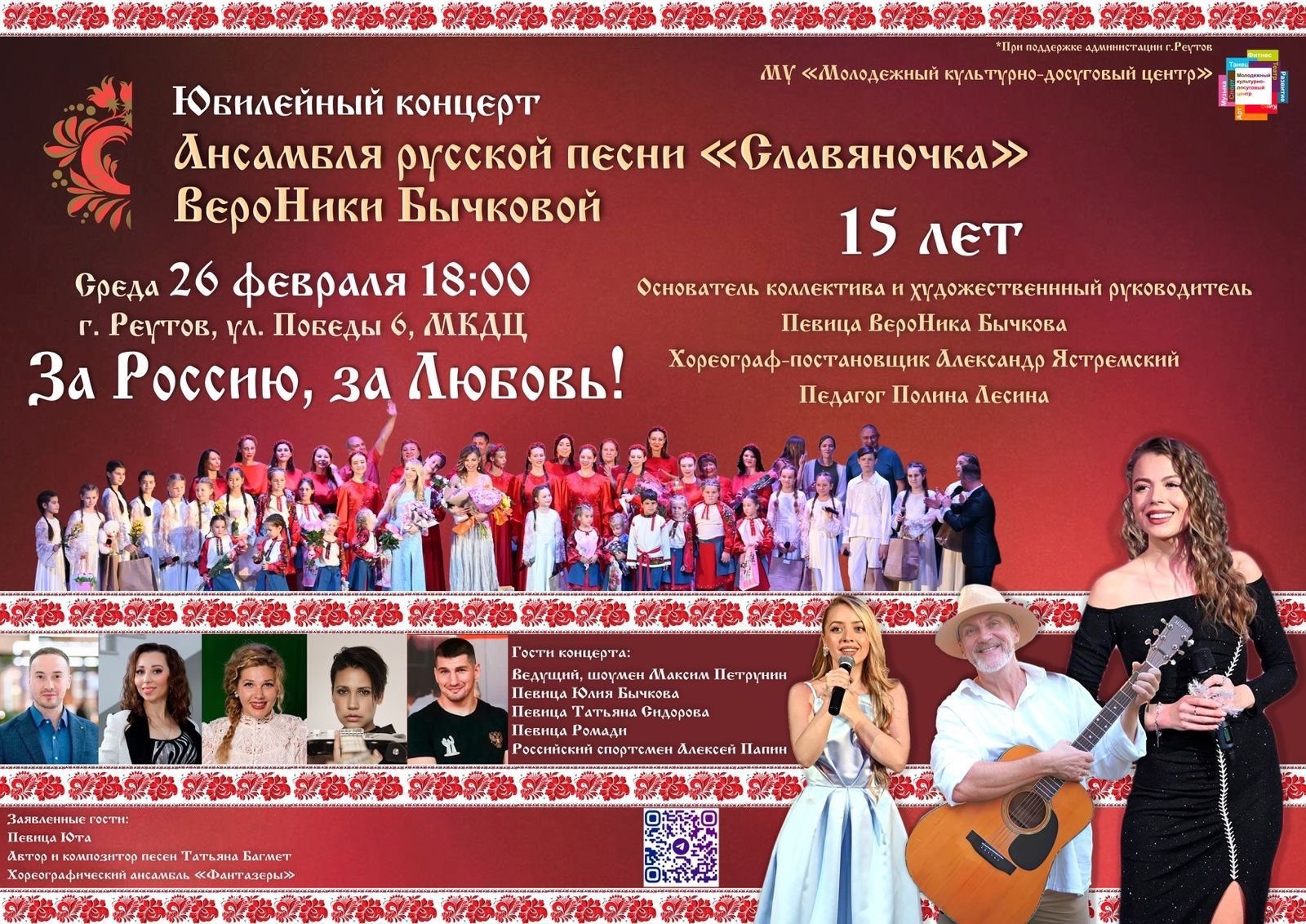 26 февраля 2025 года в 18.30 состоится Юбилейный концерт Ансамбля русской песни «Славяночка» ВероНики Бычковой. Вход свободный, а посмотреть будет на что и на кого - кроме замечательного реутовского коллектива, на сцену выйдут и приглашенные артисты.