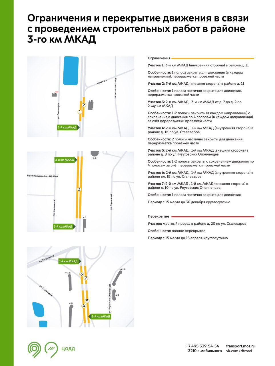 «С 15 марта до 30 декабря на участках 1, 2 и 3 км МКАД будут недоступны для движения одна-две полосы. Это связано с проведением строительных работ», — говорится в сообщении.