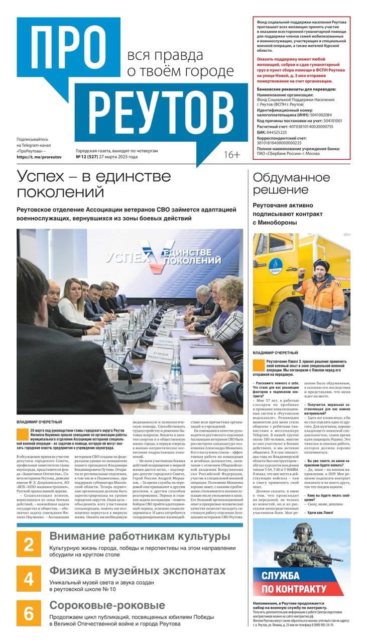 В четверг, 27 марта, вышел 12-й (527) выпуск бесплатной газеты «ПроРеутов».