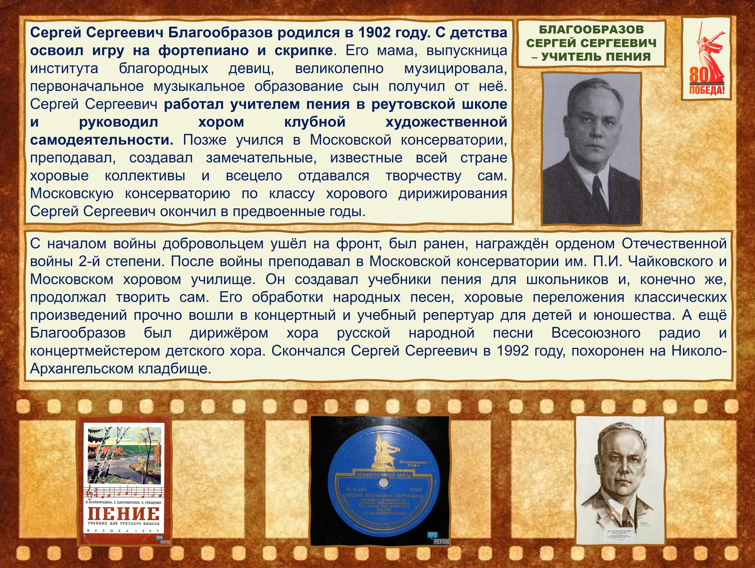 Сергей Сергеевич Благообразов родился в 1902 году. С детства освоил игру на фортепиано и скрипке. Его мама, выпускница института благородных девиц, великолепно музицировала, первоначальное музыкальное образование сын получил от неё. Сергей Сергеевич работал учителем пения в реутовской школе и руководил хором клубной художественной самодеятельности. Позже учился в Московской консерватории, преподавал, создавал замечательные, известные всей стране хоровые коллективы и всецело отдавался творчеству сам. Московскую консерваторию по классу хорового дирижирования Сергей Сергеевич окончил в предвоенные годы.