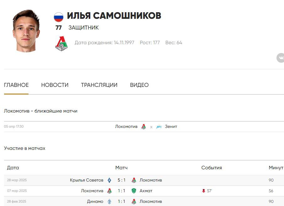 Илья Самошников, единственный представитель Реутова в высшем дивизионе российского футбола - Российской Премьер-лиги, залечил травму, полученную в начале марта после возобновления матчей весенней части сезона 2024–2025 годов. Илья провел все 90 минут в гостевой игре против "Крыльев Советов".