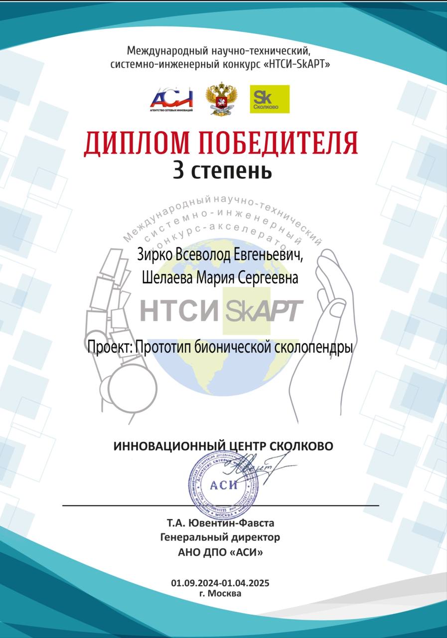 Обучающиеся Изобретариума Зирко Всеволод и Шелаева Мария стали победителями конференции НТСИ-SkART 2025! Их инновационный проект “Прототип бионической сколопендры” занял призовое место, получив диплом III степени в старшей возрастной категории!