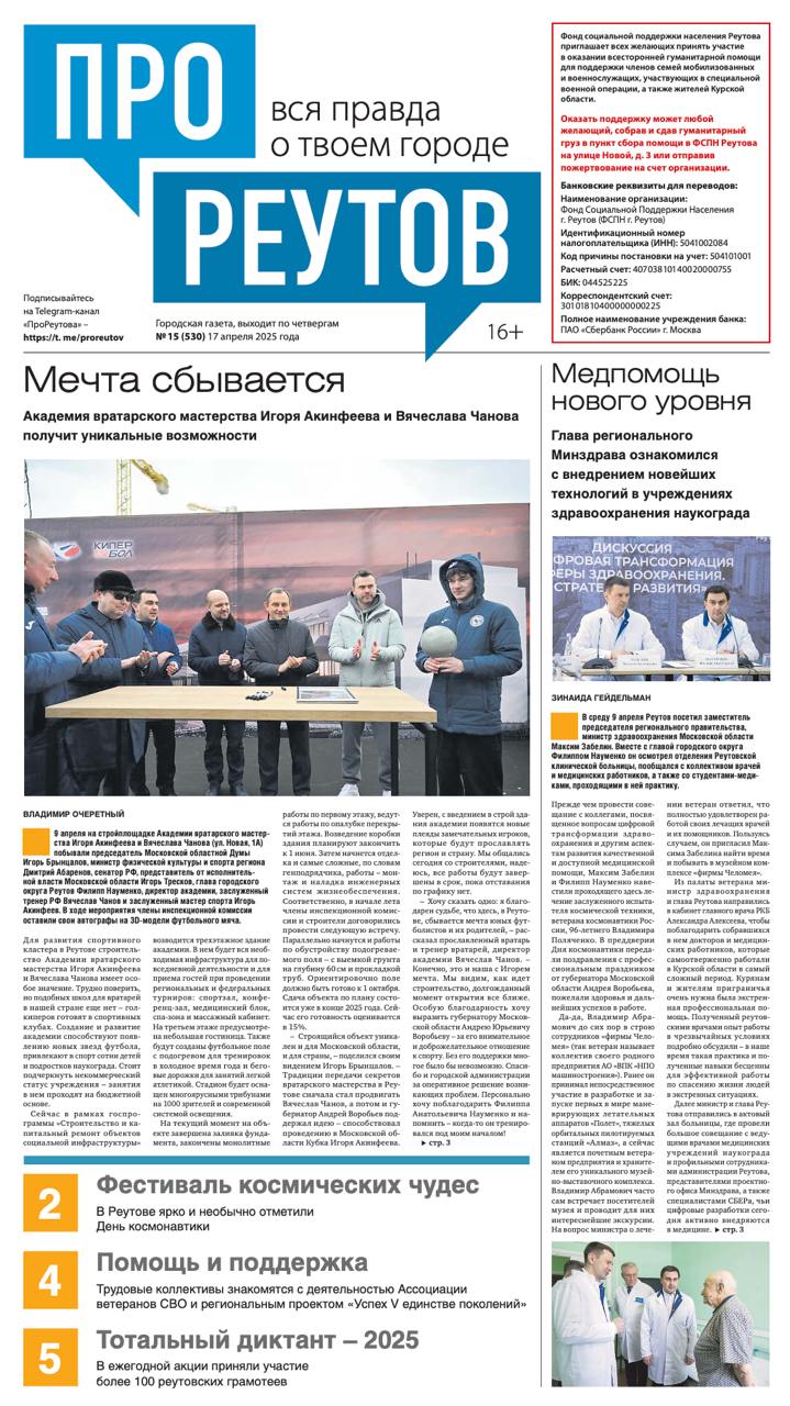 В четверг, 17 апреля, вышел 15-й (530) выпуск бесплатной газеты «ПроРеутов».