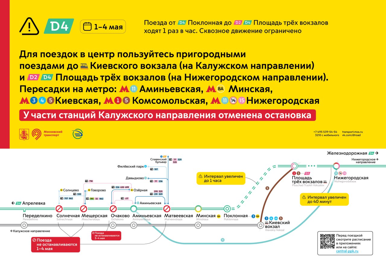🔹 С 1 по 4 мая поезда не останавливаются на Солнечной (в сторону центра), Мещерской и Матвеевской, 3 и 4 мая — на станции Очаково. Пользуйтесь наземным транспортом.