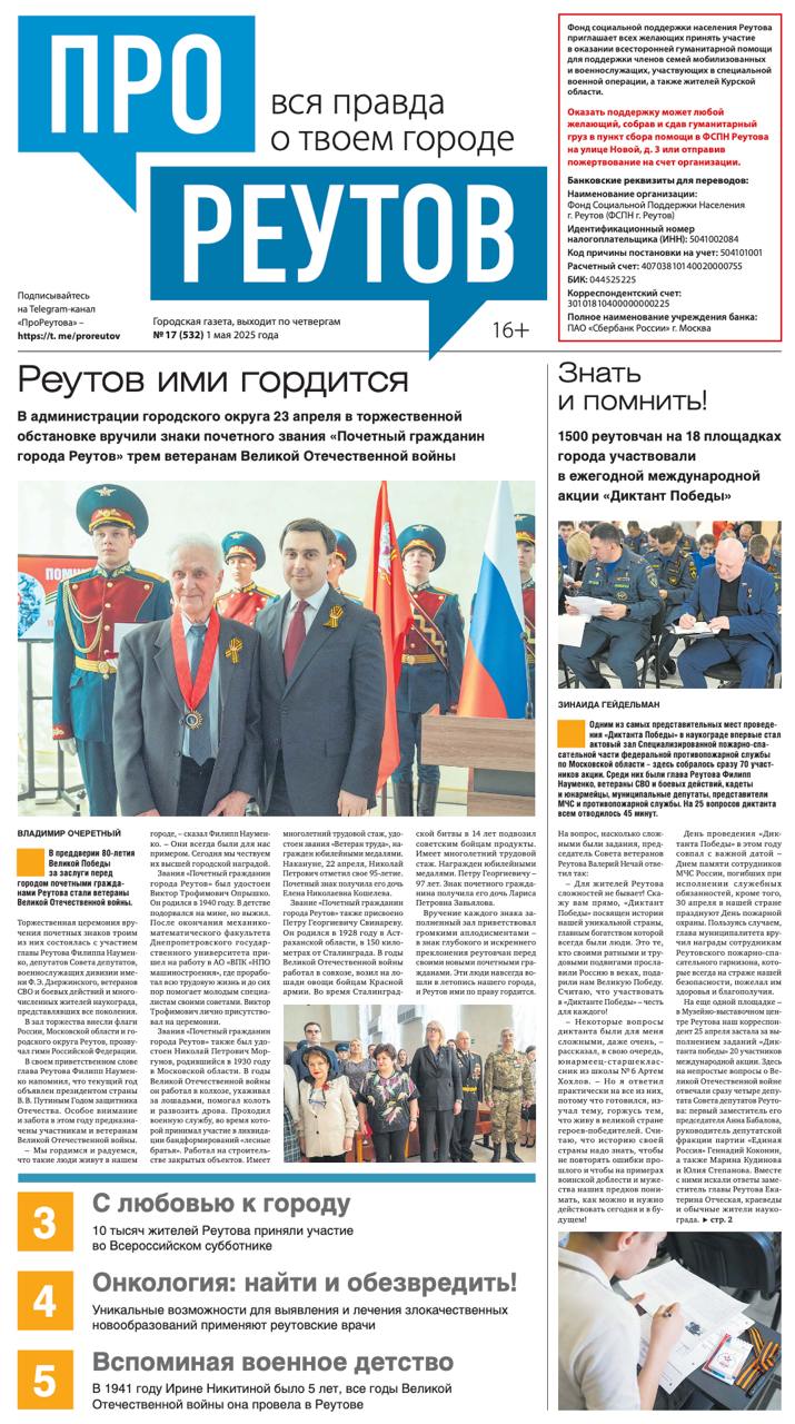 В среду, 30 апреля, вышел 17-й (532) выпуск бесплатной газеты «ПроРеутов».