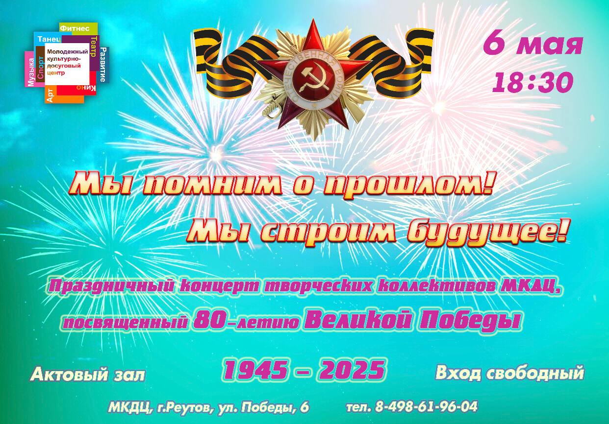 Приглашаем Вас на торжественную концертную программу от коллективов Молодежного центра, посвящённую 80-летию Победы 6 мая в 18:30.Адрес: г.Реутов, ул.Победы, 6 («Молодежный культурно-досуговый центр»)