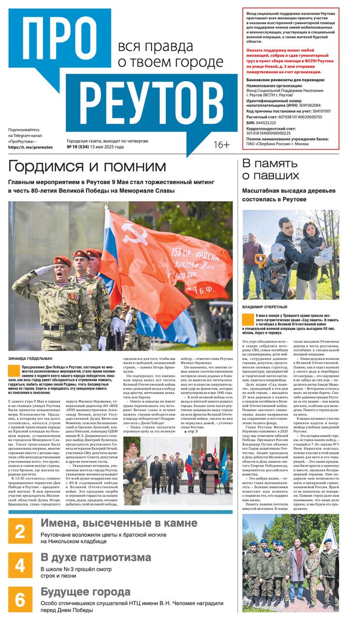 В четверг, 15 мая, вышел 19-й (534) выпуск бесплатной газеты «ПроРеутов».