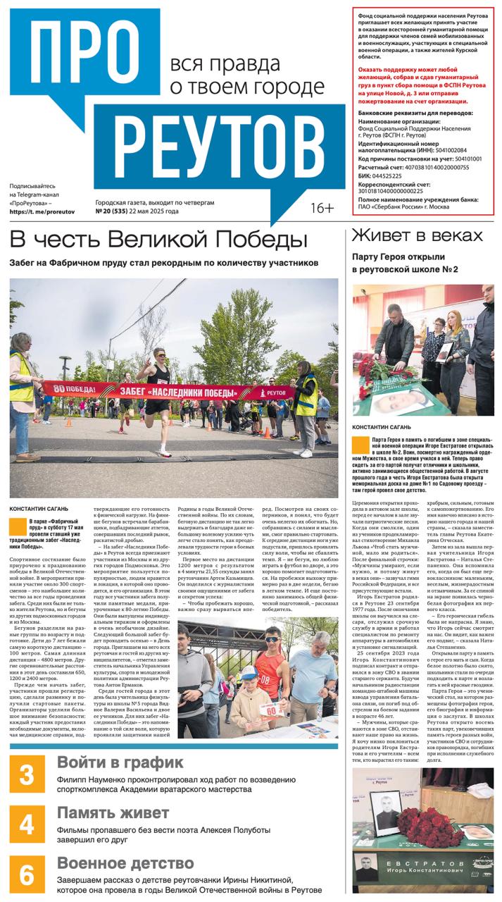 В четверг, 22 мая, вышел 20-й (535) выпуск бесплатной газеты «ПроРеутов».