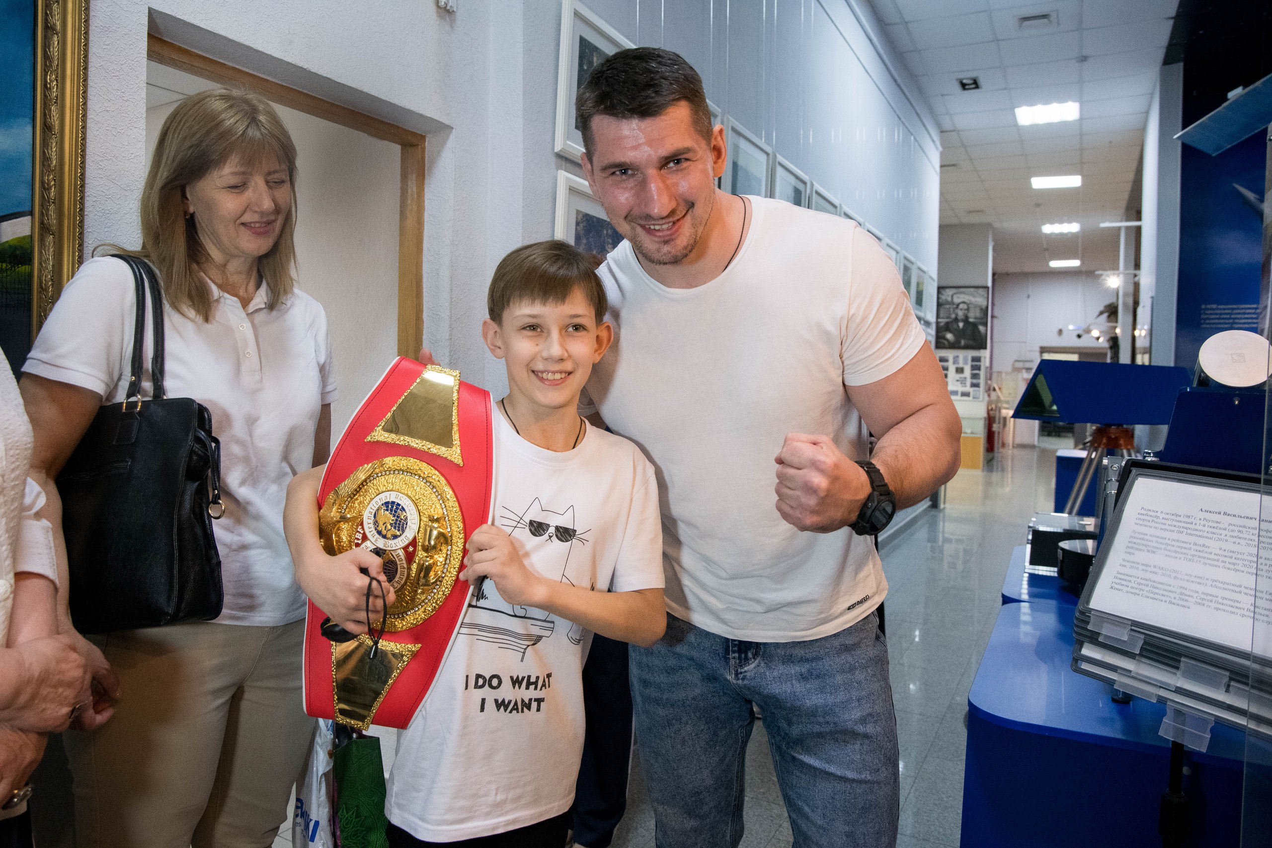 А дальше Марка ждала встреча с чемпионом мира по боксу Алексеем Папиным. При знакомстве с Марком он помог ему примерить свой чемпионский пояс, который сейчас бережно хранится среди экспонатов Музейно-выставочного центра. А вот агитировать парнишку быть первым в том виде единоборств, которым Марк занимается, Алексей Папин не стал: