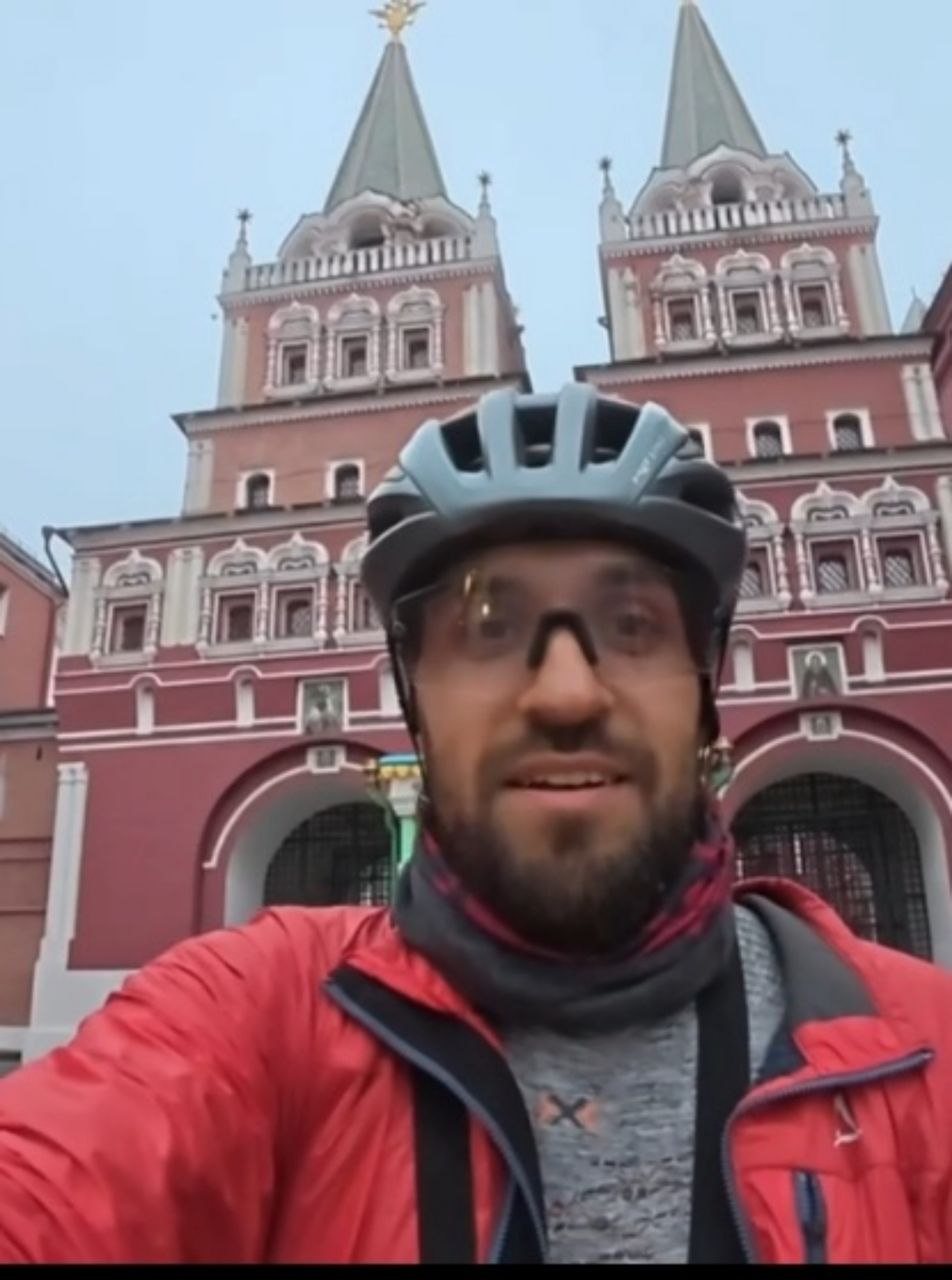 В путь отважный велосипедист отправился 14 июня с нулевого километра России от стен Московского Кремля. Каждый день он накручивает в зависимости от погодных условий по 200-300 километров.