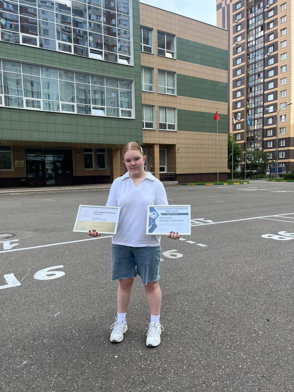 Сегодня ученица 10 класса, Барздыко Варвара, получила заслуженное признание за свою выдающуюся работу в качестве волонтера в Московской области.