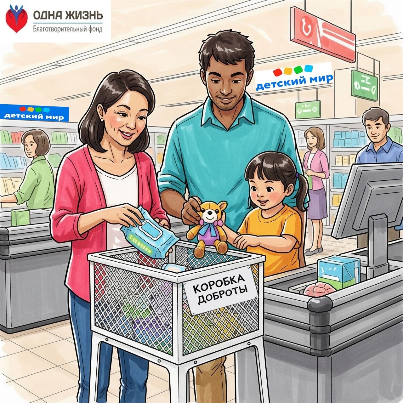 В рамках сотрудничества с магазином «Детский мир», фонд "Одна жизнь" реализует акцию «Коробка доброты» в помощь семьям, оказавшимся в трудной жизненной ситуации.