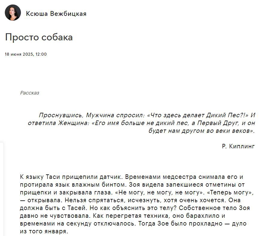 Новый рассказ писательницы из Реутова Ксюши Вежбицкой "Просто собака", опубликованный во втором за этот год номере журнала "Юность", появился на сайте издания.