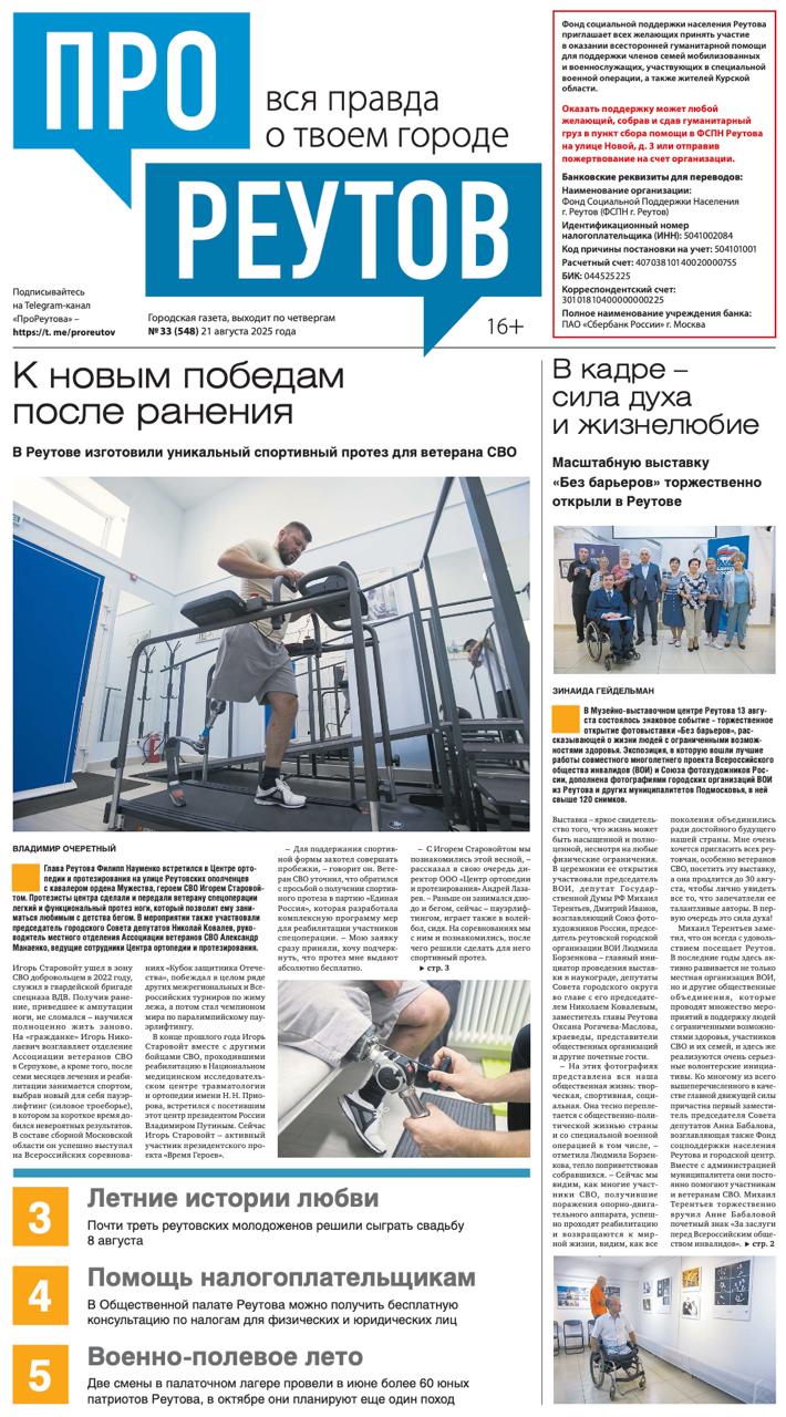 В четверг, 21 июля, вышел 33-й (548) выпуск бесплатной газеты «ПроРеутов».