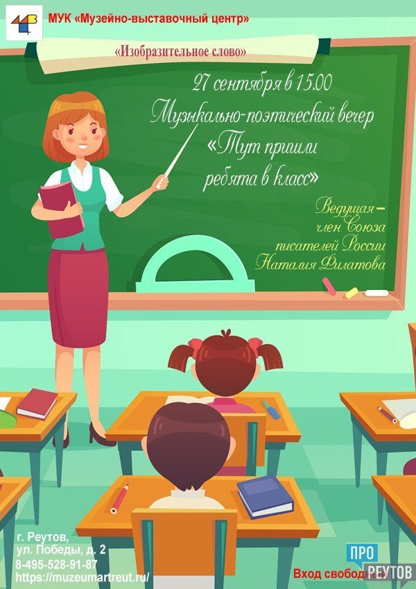Музейно-выставочный центр Реутова приглашает всех 27 сентября в 15.00 на музыкально-поэтический вечер «Изобразительное слово», посвященный Дню учителя предстоящему Дню учителя, а также чарующему миру детской литературы и её вдохновенным авторам!