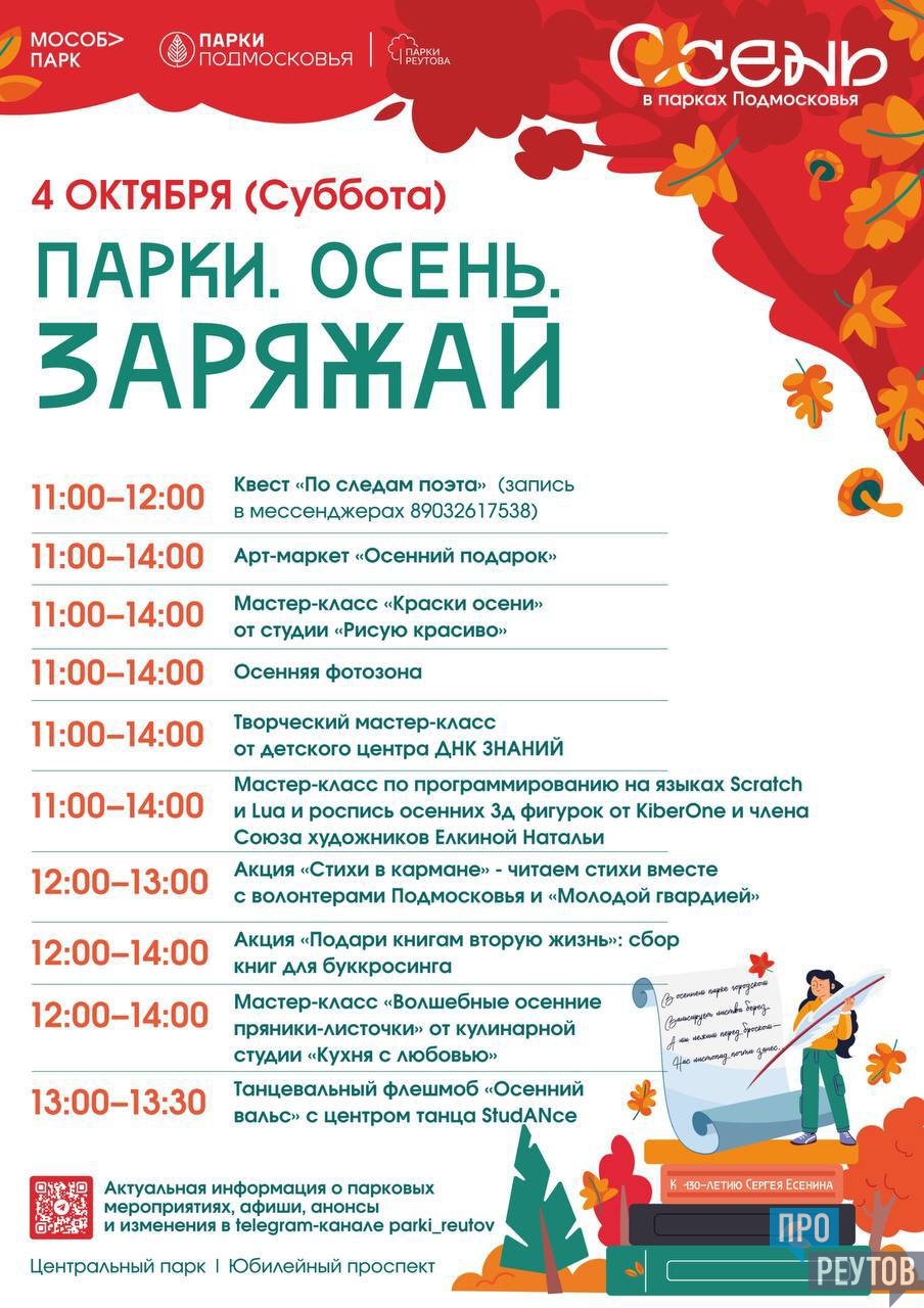 В первую субботу октября в Центральном парке Реутова пройдет литературный квест «По следам поэта». Он — часть большой субботней программы — «Парки. Осень. Заряжай».