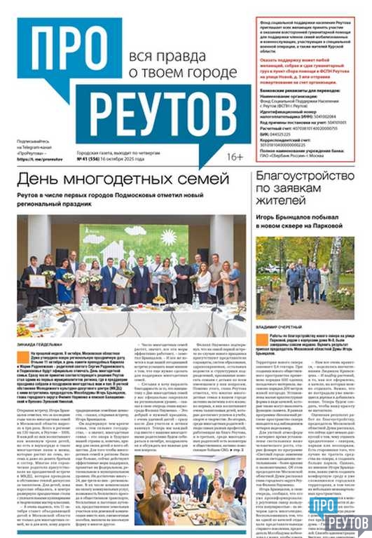 В четверг, 16 октября, вышел 41-й (556) выпуск бесплатной газеты «ПроРеутов»