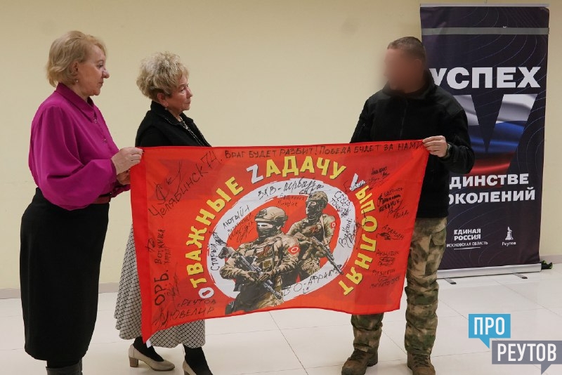Присутствующий на встрече участник СВО Петр Б., приехавший домой в отпуск, подарил ФСПН флаг своего подразделения с автографами бойцов. На мероприятии был показан ролик с передовой: бойцы благодарили реутовчан за гуманитарную помощь и поздравляли с наступающим Новым годом. Поздравление заканчивается словами: