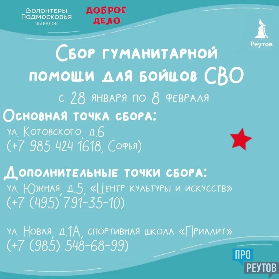 Администрация городского округа Реутов совместно с общественным движением «Волонтёры Подмосковья» инициировали благотворительную акцию «Доброе дело». Её цель — сбор необходимых товаров для участников специальной военной операции.