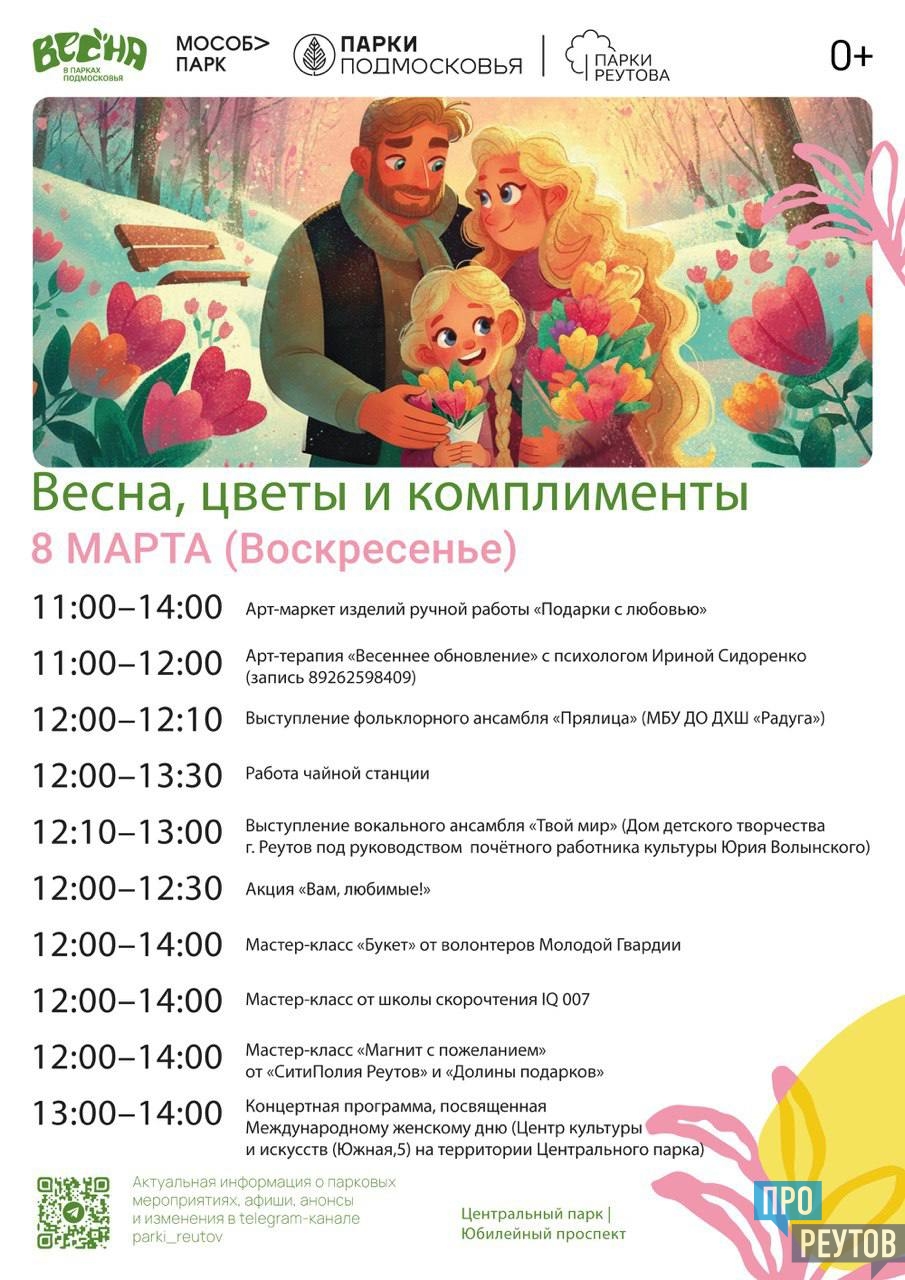 Организаторы приглашают всех желающих провести этот день в атмосфере тепла и радости. Встречаемся 8 марта у главной сцены Центрального парка Реутова. Начало — в 12:00. Вход свободный.